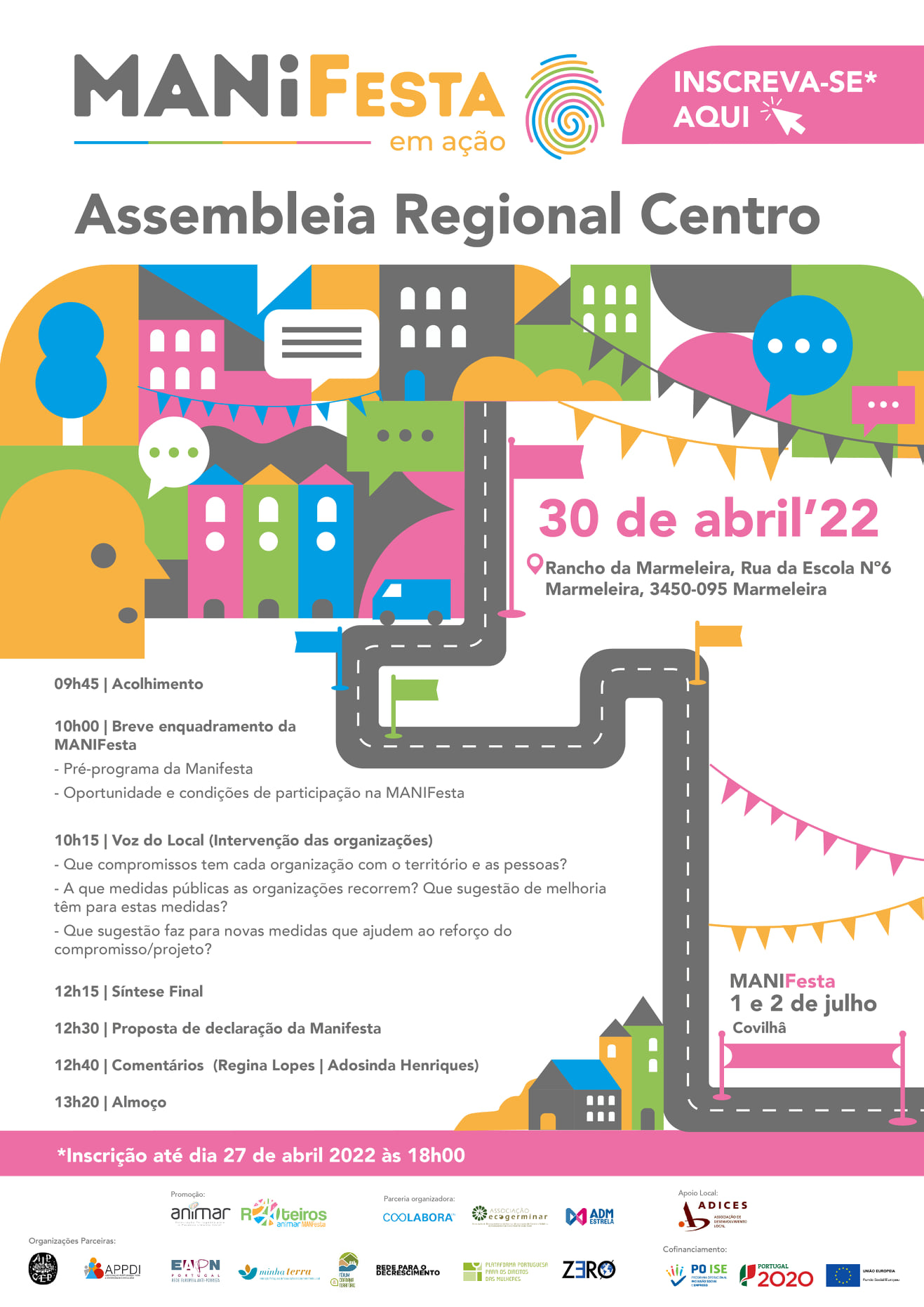 Decorre no próximo dia 30 de abril a primeira de quatro assembleias regionais da iniciativa MANIFesta, que em 2022 continua o caminho de reflexão e construção de propostas em prol da criação de comunidades justas e sustentáveis. O evento decorre na Marmeleira, concelho de Mortágua, nas instalações do Rancho da Marmeleira, a partir das 10:00.