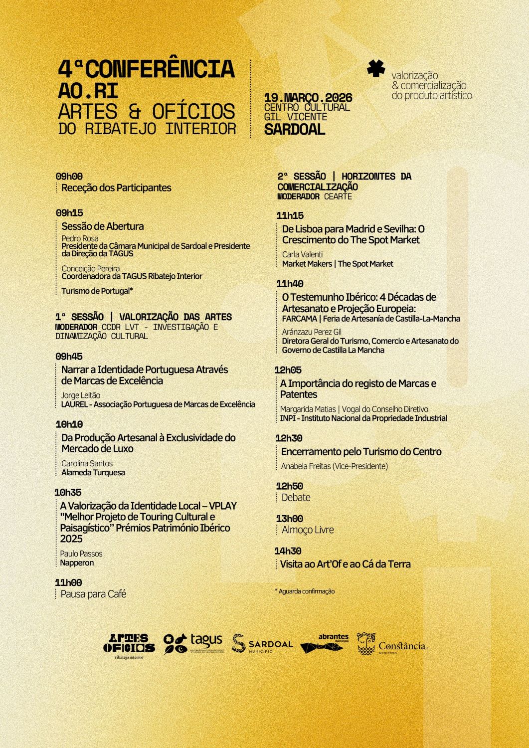 Sardoal vai ser palco, no dia 19 de março, da 4.ª edição da Conferência AO.RI – Artes e Ofícios do Ribatejo Interior. Sob o mote a “Valorização & Comercialização do Produto Artístico”, esta iniciativa terá como oradores Laurel, Alameda Turquesa, Napperon, The Spot Market, INPI, Turismo de Portugal e Turismo Centro e uma representante do Governo de Castilla-La Mancha, em Espanha.