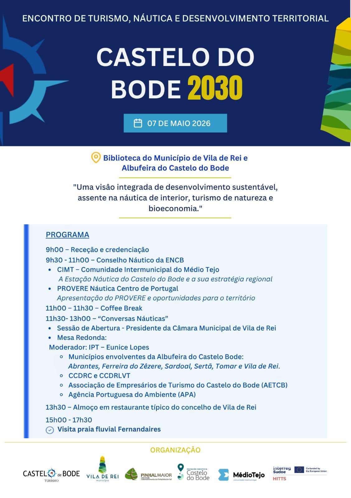 No próximo dia 7 de maio vai realizar-se o Encontro de Turismo, Náutica e Desenvolvimento Territorial “Castelo do Bode 2030”, dirigido ao tecido empresarial da região ligado a este património natural. Este evento é organizado em parceria pela CIM Médio Tejo, a Associação dos Empresários de Turismo do Castelo de Bode, o Município de Vila de Rei e o GAL PINHAL MAIOR.