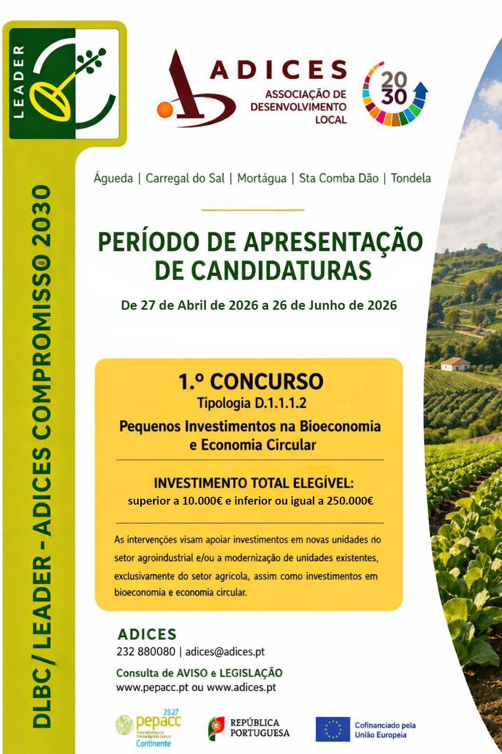 O período para submissão das candidaturas começou no dia 27 de abril e vai decorrer até 26 de junho de 2026. Os apoios destinam-se à tipologia D.1.1.1.2. “Pequenos Investimentos na bioeconomia e economia circular”, no quadro do PEPAC e abrangem o território de intervenção, Águeda, Carregal do Sal, Mortágua, Santa Comba Dão e Tondela.