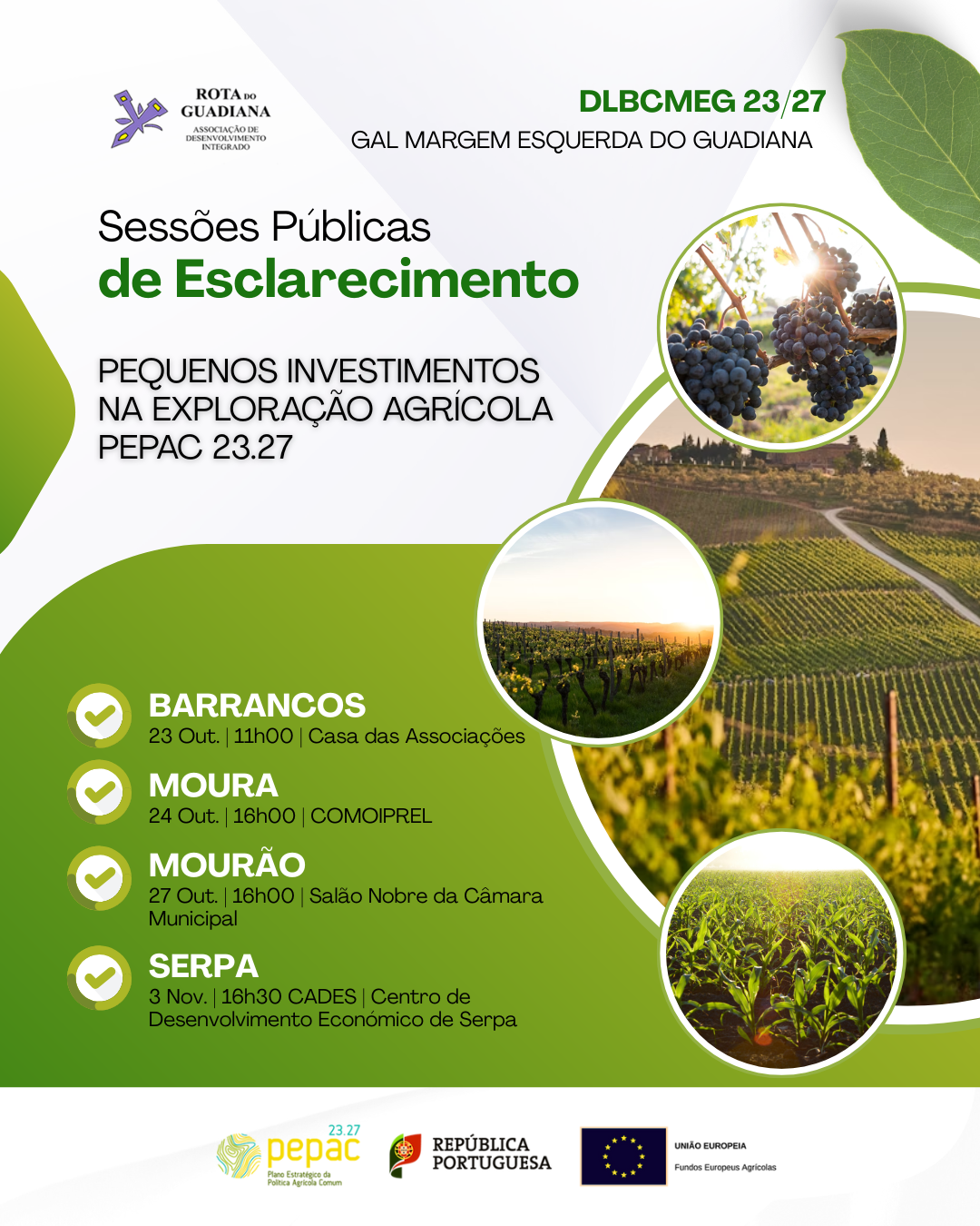 O Grupo de Ação Local (GAL) Margem Esquerda do Guadiana, gerido pela Rota do Guadiana, vai promover um conjunto de sessões públicas de esclarecimentos sobre o concurso da intervenção "Pequenos Investimentos na Exploração Agrícola" da Medida do Desenvolvimento Local de Base Comunitária (DLBC) do Plano Estratégico da Política Agrícola Comum no Continente (PEPAC no Continente), aberto até 12 de dezembro.