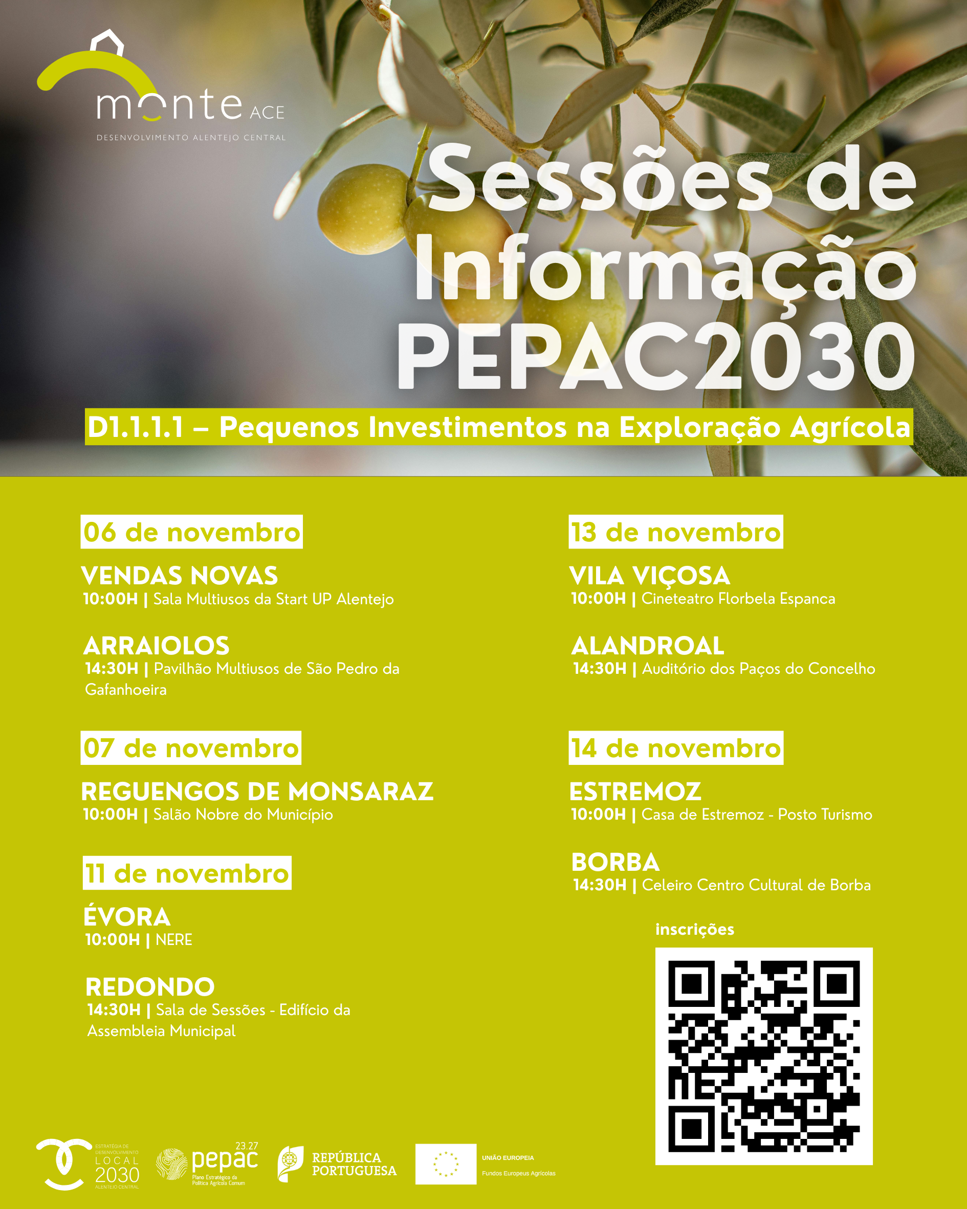 O objetivo destas sessões é informar agricultores, produtores e empreendedores rurais sobre as oportunidades de financiamento disponíveis no âmbito do PEPAC 2030, incentivando o investimento sustentável e a inovação nas explorações agrícolas do Alentejo Central.