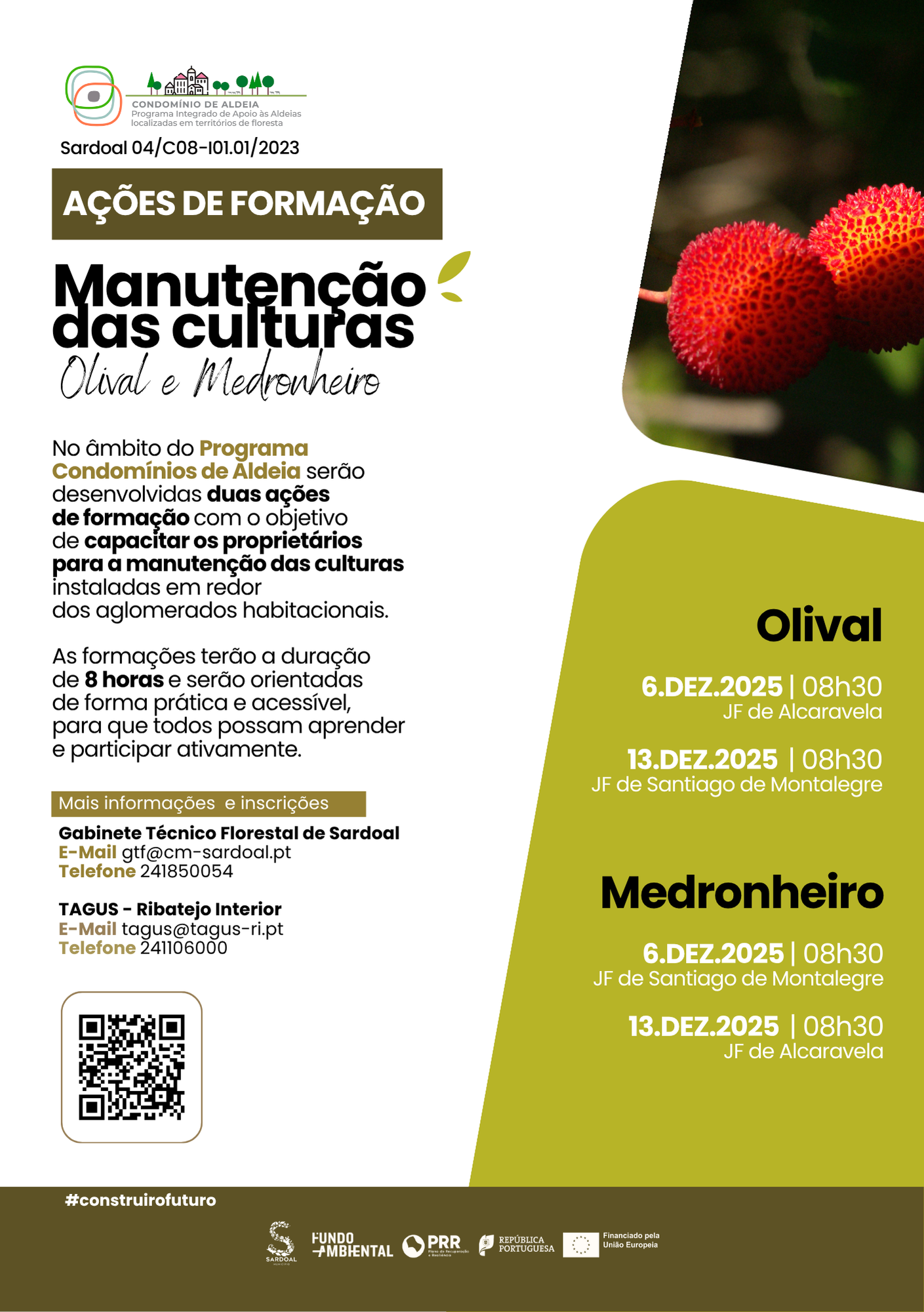 O Município do Sardoal, no âmbito do Programa Condomínios de Aldeia, vai promover duas ações de formação dedicadas à manutenção das culturas de olival e medronheiro, nos dias 6 e 13 de dezembro, em Alcaravela e Santiago de Montalegre. Estas iniciativas visam capacitar os proprietários para uma gestão adequada das culturas instaladas na envolvente dos aglomerados populacionais.