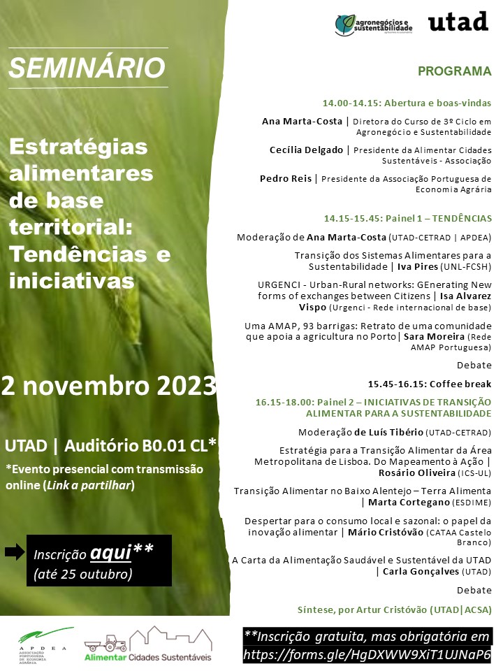 Irá decorrer no próximo dia 2 de novembro, a partir das 14:00, no Auditório B0.01 CL da UTAD - Universidade de Trás-os-Montes e Alto Douro, o Seminário "Estratégias alimentares de base territorial: Tendências e iniciativas" organizado pela APDEA -Associação Portuguesa de Economia Agrária em parceria com a Alimentar Cidades Sustentáveis - Associação e com o curso de doutoramento em Agronegócios e Sustentabilidade, em consórcio entre a UTAD e Alto Douro e a Universidade de Évora.