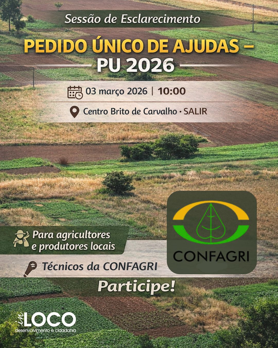 A Associação In Loco convida os agricultores e produtores locais a participar numa sessão dedicada aos Pagamentos Diretos e medidas de Desenvolvimento Rural no próximo dia 3 de março, pelas 10:00, no Centro Brito de Carvalho, em Salir (Loulé).